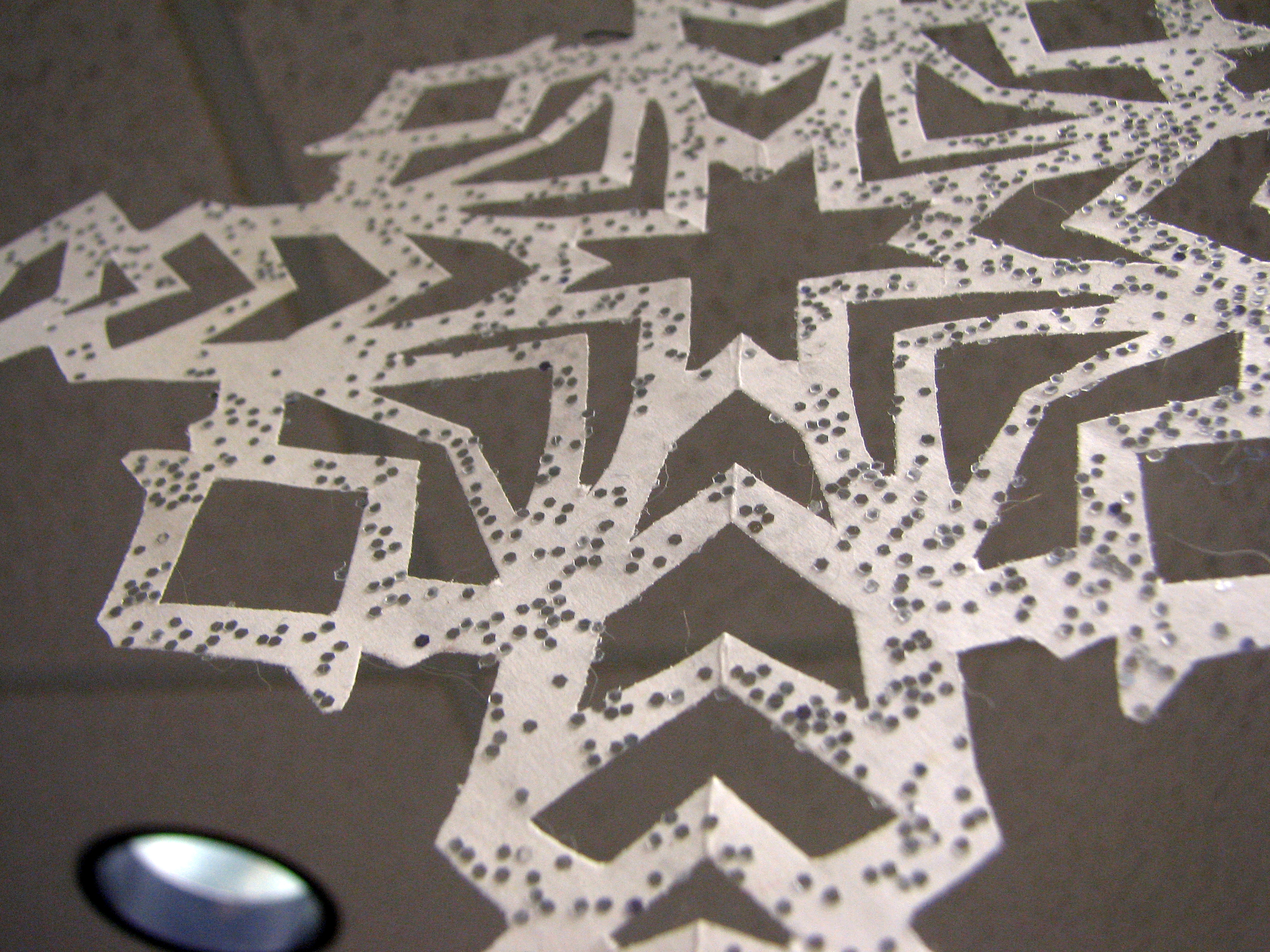 Many years ago, each department in the institute where I work was given the task of decorating a room for our holiday party. Most departments had a budget, our did not, so we spent hours cutting out snowflakes and gluing on glitter (much as I wish it was, this wasn’t my idea). We ended up with enough to fill the room and it was very pretty. We held onto some of them and a few are hanging in my library.